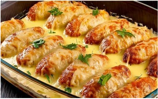 Rolinhos de repolho recheados sobre uma cama de legumes e cobertos com queijo: um clássico delicioso para toda a família!