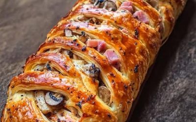 Trança gourmet de massa folhada com cogumelos, presunto e queijo.