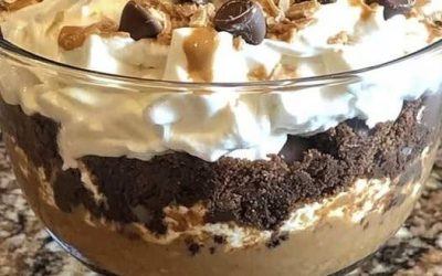 Um pedacinho do paraíso em uma tigela: uma sobremesa decadente em camadas com brownie, manteiga de amendoim e chantilly. Receita nos comentários.